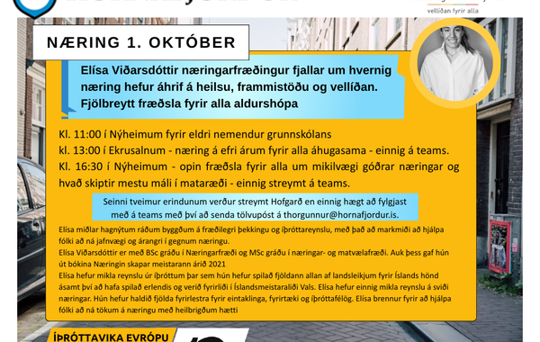Fræðsluerindi Elísu Viðarsdóttur næringarfræðings um hvernig næring hefur áhrif á heilsu, frammistöðu og vellíðan 1. október