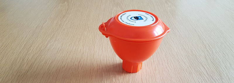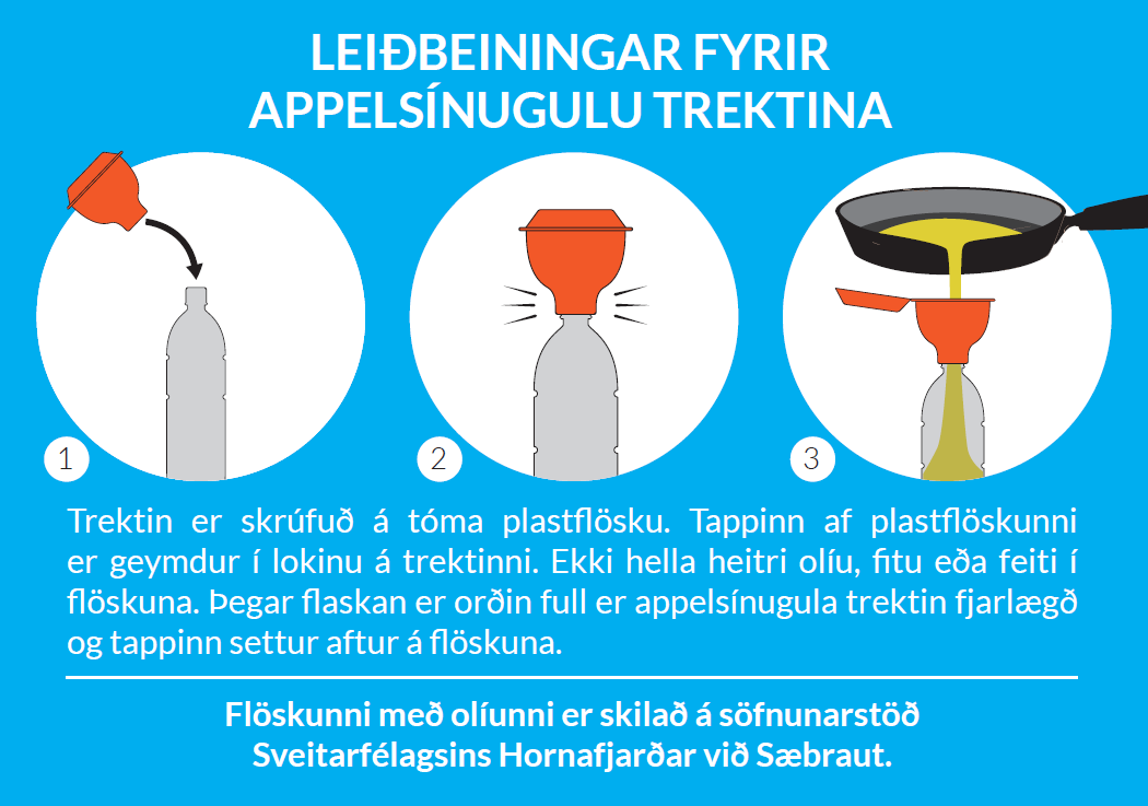 Trektin er skrúfuð á tóma plastflösku. Tappinn af plastflöskunni er geymdur í lokinu á trektinni. Ekki hella heitri olíu, fitu eða feiti í flöskuna. Þegar flaskan er orðin full er appelsínugula trektin tekin af og tappinn settur á flöskuna og henni skilað á söfnunarstöðina.