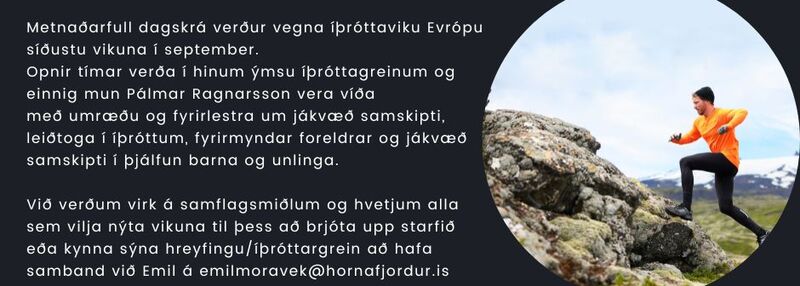 Við verðum virk á samfélagsmiðlum og hvetjum alla sem vilja nýta vikuna til þess að brjóta upp starfið eða kynna sýna hreyfingu/íþróttargrein að hafa samband við Emil, verkefnastjóra á Fræðslu- og frístundarsvið, á netfangið emilmoravek@hornafjordur.is