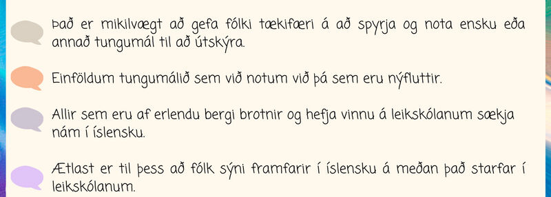 Í kjölfar fjölmenningarnámskeiðs sem haldið var 16. ágúst með öllu starfsfólki á fræðslu og frístundasvið var ákveðið að fyrsta skrefið væri tungumálastefna fyrir leikskólann sem hér birtist. Grunnur tungumálastefnunnar felst í þeirri hugsun að samfélagið sé lykillinn að því að fólk læri íslensku. Það er mikilvægt að meta bæði margbreytileika mannlífsins og fjölbreytta tungumálakunnáttu og líta á hvorttveggja sem auð á sama tíma og við gefum fólki af erlendum uppruna gnægð tækifæra til að læra íslensku.